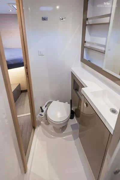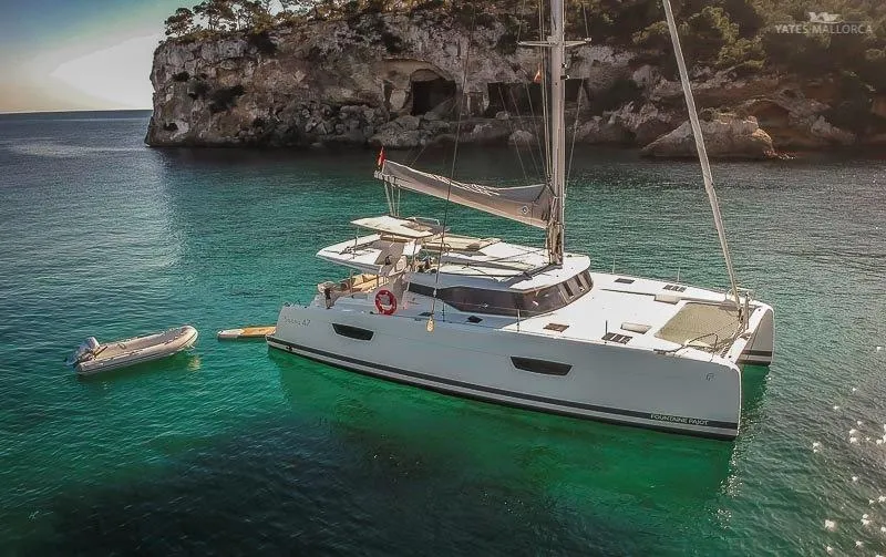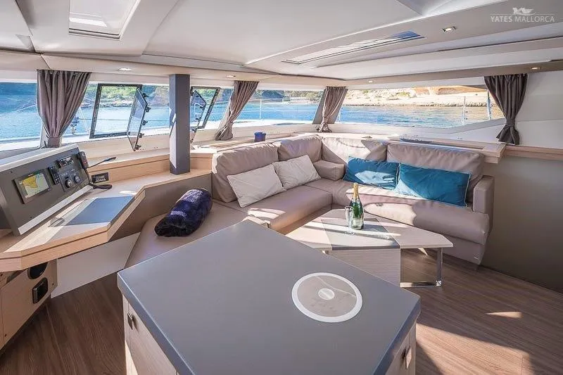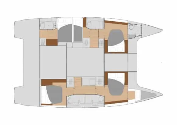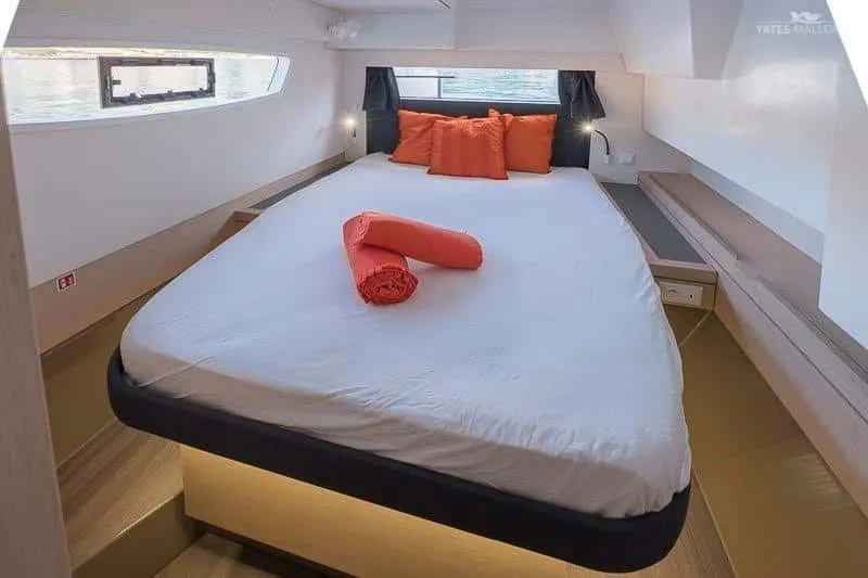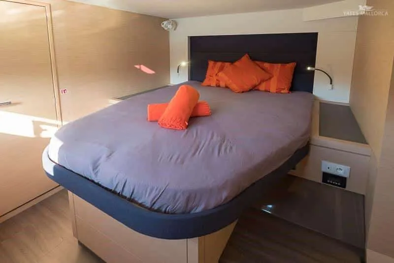 Bei uns im Charter ab/bis Palma de Mallorca fährt dieser Fountaine Pajot Saona 47 in der 5 Kabinen und 5 Bädern Version. In 4 Doppelkabinen und 1 Stockbettenkabine jeweils mit eigenem Bad ist bequem Platz für 10 Personen. Im Vorpiek befindet sich außerdem eine Skipperkabine, die Dank zusätzlicher Verbindungstür zur Bugkabine auch gern als Kinderkabine genutzt wird.