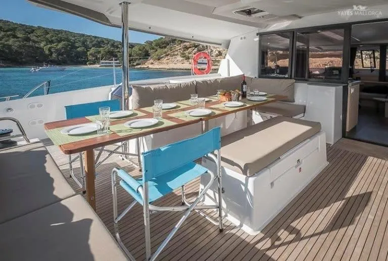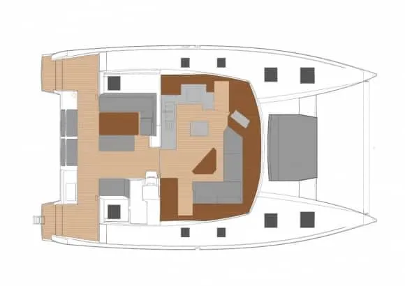 Das große Cockpit des Segelkatamaran Fountaine Pajot Saona 47 mit Teakdeck und Gasgrill ausgestattet lädt zum Kochen und Verweilen im Schatten ein. Am großen Esstisch finden durch eine Verlängerung alle bis zu maximal 12 Crewmitglieder Platz. Küche und Salon integrieren sich bei geöffneten Türen und Fenstern zu einem großen Lebensraum mit vielen Sitz- und Liege- Möglichkeiten.