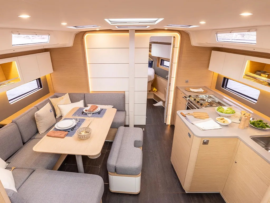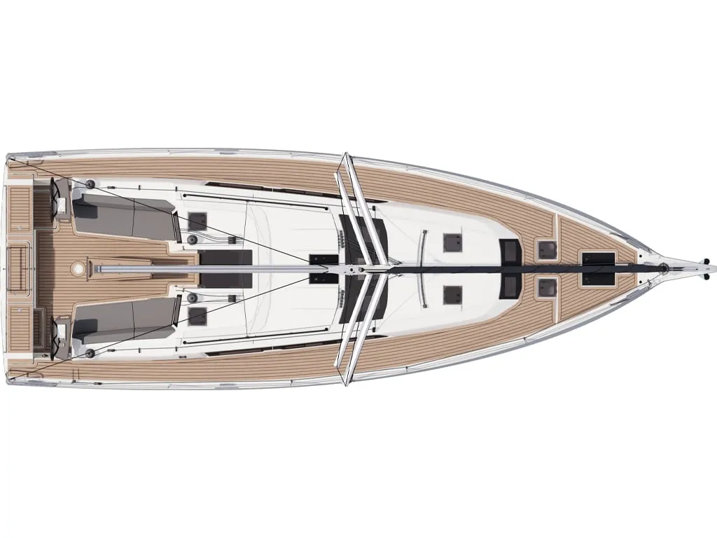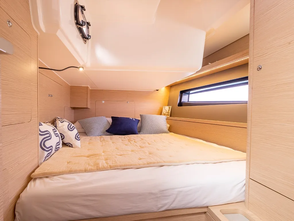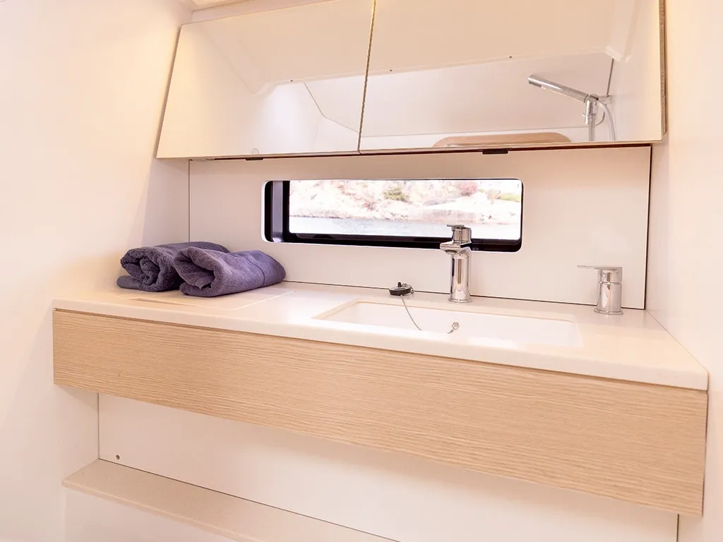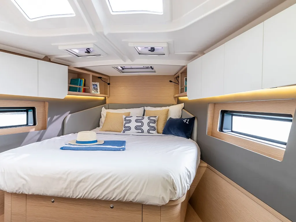An Bord der 3-Kabinen-Version erleben Sie eine großzügige, lichtdurchflutete Raumaufteilung: Die Eignerkabine im Vorschiff bietet ein großes Doppelbett, viel Stauraum und ein eigenes Bad. Zwei weitere komfortable Gästekabinen im Heck – jeweils mit eigenem Zugang zum Badezimmer – sorgen für Privatsphäre und Wohlfühlatmosphäre an Bord. Mit viel Platz, durchdachten Staumöglichkeiten und einer modernen Pantry entlang des Rumpfs lässt sich das Leben an Bord frei und unkompliziert gestalten – ideal für längere Törns oder Wochenenden auf dem Meer.