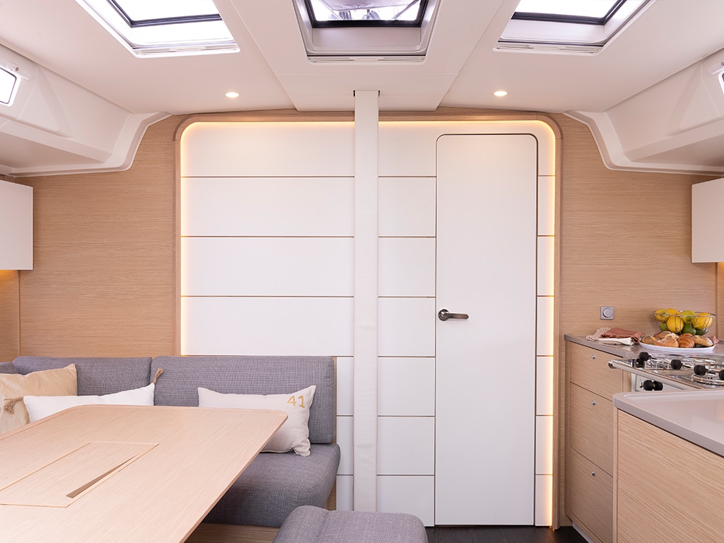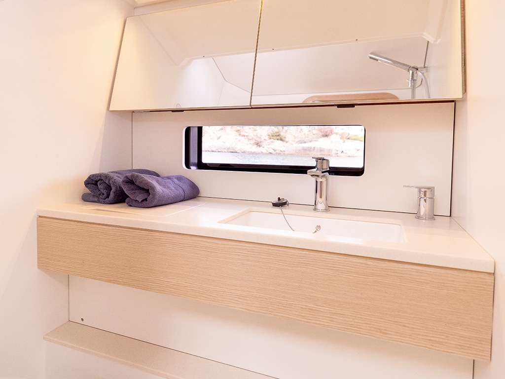 An Bord der 3-Kabinen-Version erleben Sie eine großzügige, lichtdurchflutete Raumaufteilung: Die Eignerkabine im Vorschiff bietet ein großes Doppelbett, viel Stauraum und ein eigenes Bad. Zwei weitere komfortable Gästekabinen im Heck – jeweils mit eigenem Zugang zum Badezimmer – sorgen für Privatsphäre und Wohlfühlatmosphäre an Bord. Mit viel Platz, durchdachten Staumöglichkeiten und einer modernen Pantry entlang des Rumpfs lässt sich das Leben an Bord frei und unkompliziert gestalten – ideal für längere Törns oder Wochenenden auf dem Meer.